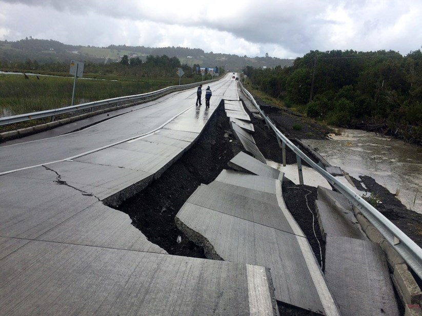 Fig. Estrada danificada pelo abalo em Tarahuin, na ilha Chiloe, no Sul do Chile